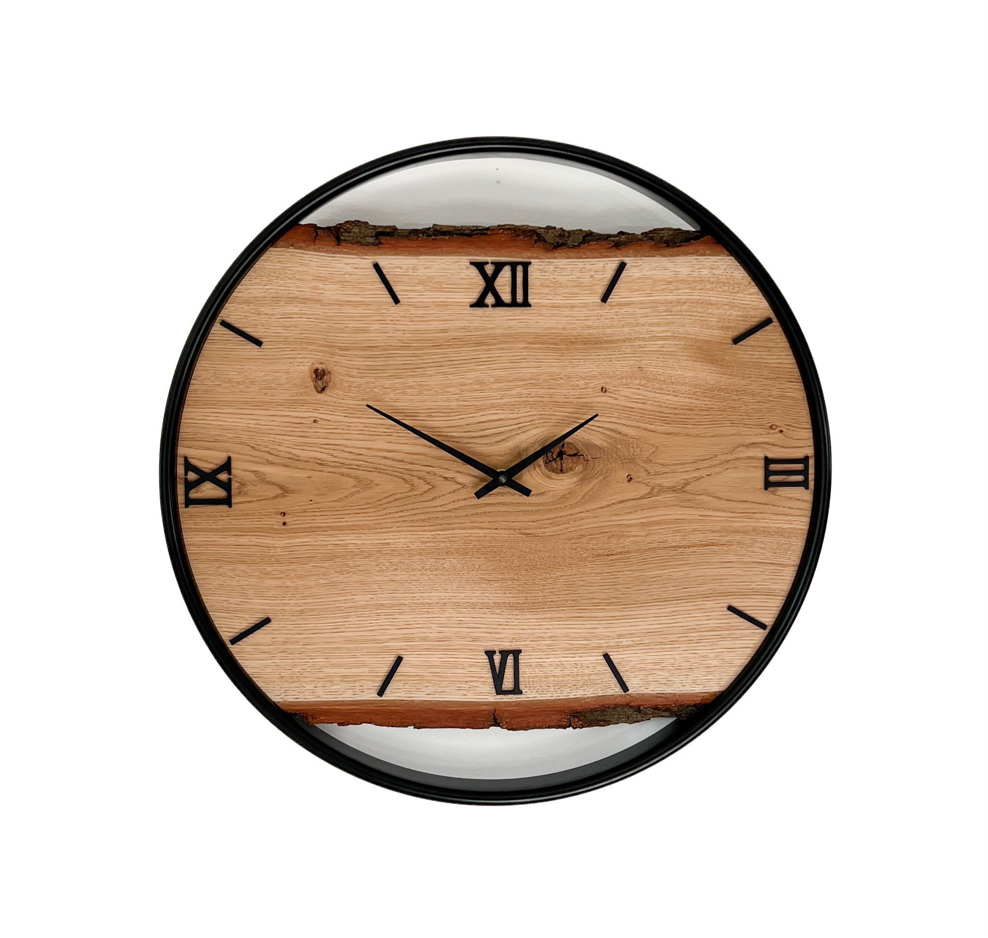 Produktbeschreibung: Diese einzigartige Wanduhr besteht aus Eichenholz, das aus heimischen Wäldern stammt. Das Holz wurde sorgfältig mit Bienenwachs behandelt, um seine natürliche Schönheit zu betonen und zu schützen. Um das Holz herum befindet sich ein pulverbeschichteter Edelstahlring, der einen eleganten Kontrast zum Holz bildet.